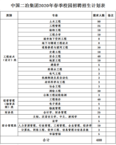 公司 2020 年春季招聘計(jì)劃招收總計(jì) 400 人(詳見(jiàn)附件)。